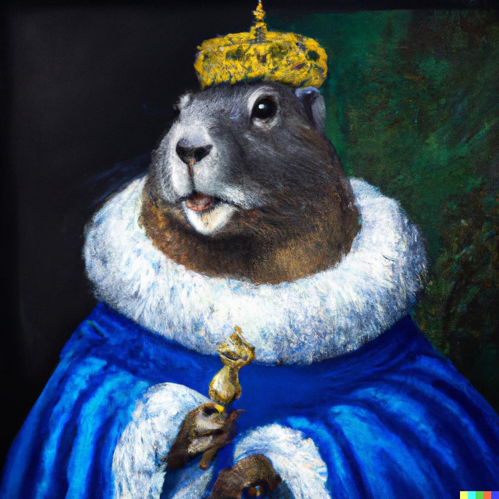 “an oil painting portrait of a gopher wearing a blue medieval royal robe and an ornate crown on a dark